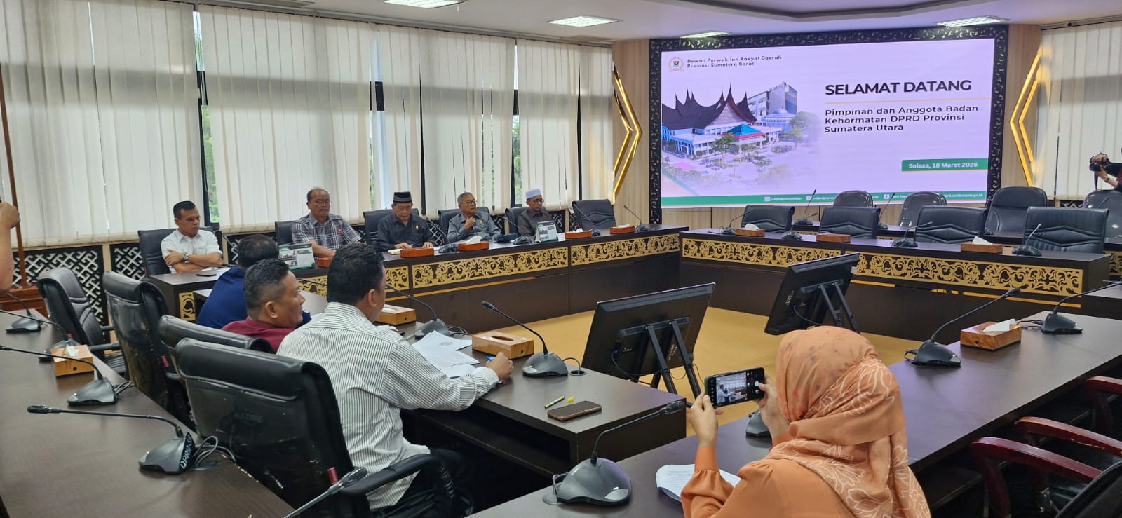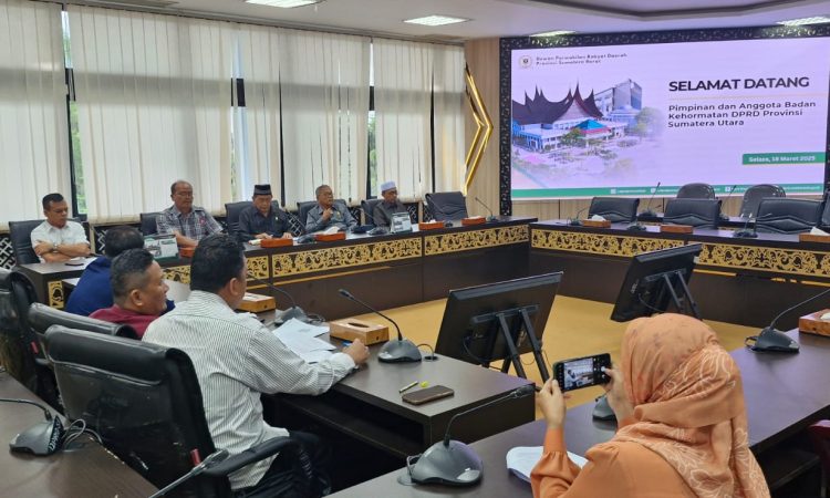 Badan Kehormatan (BK) DPRD Provinsi Sumatera Barat menerima kunjungan Pimpinan dan Anggota BK DPRD Provinsi Sumatera Utara pada Senin (17/3) di Ruang Khusus 1 DPRD Sumbar.