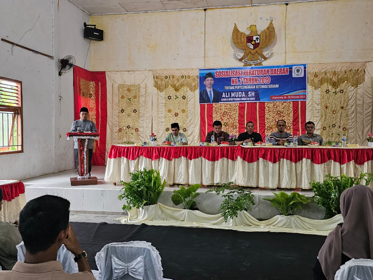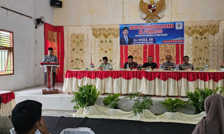 Anggota Komisi II DPRD Provinsi Sumatera Barat, Ali Muda, SH, melaksanakan Sosialisasi Peraturan Daerah (Perda) Nomor 7 Tahun 2019 tentang Penyelenggaraan Ketenagakerjaan, di Gedung Serbaguna Jorong Bunuik Raya, Nagari Bunuik, Kecamatan Kinali, Kabupaten Pasaman Barat, Jumat (24/10/2025).