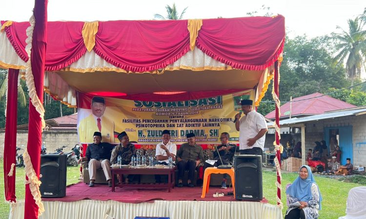 Anggota DPRD Provinsi Sumatera Barat, Zuldafri Darma, melaksanakan sosialisasi Peraturan Daerah (Perda) Nomor 9 Tahun 2018 tentang Fasilitasi Pencegahan Penyalahgunaan Narkotika, Psikotropika, dan Zat Adiktif (NAFZA) di Lapangan Sepak Bola Nagari Tigo Jangko, Kecamatan Lintau Buo, Sabtu (25/10/2025).