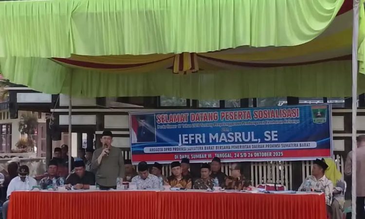 Anggota DPRD Provinsi Sumatera Barat (Sumbar) dari Fraksi Demokrat, Jefri Masrul, SE, menggelar Sosialisasi Peraturan Daerah (Perda) Nomor 17 Tahun 2018 tentang Penyelenggaraan Pembangunan Ketahanan Keluarga di Balai Adat Nagari Tigo Jangko, Kecamatan Lintau Buo, Sabtu (25/10/2025).